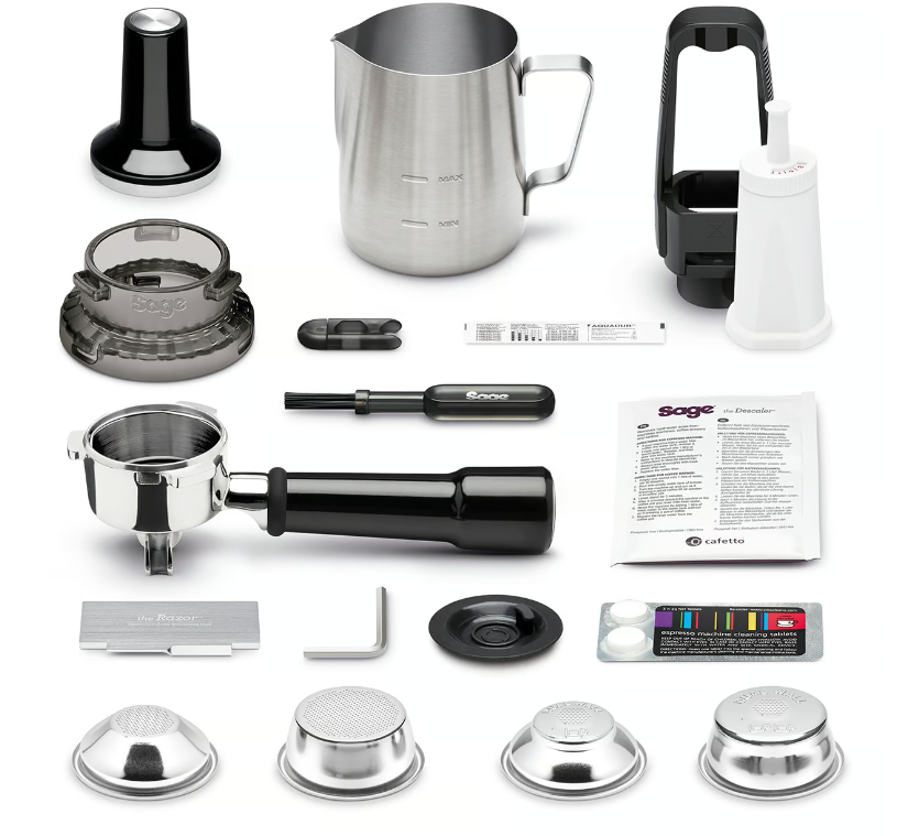 ClaroSwis water filter, Integrated tamper, The Razor™ precision dosing system, Cleaning kit, Water hardness test strip